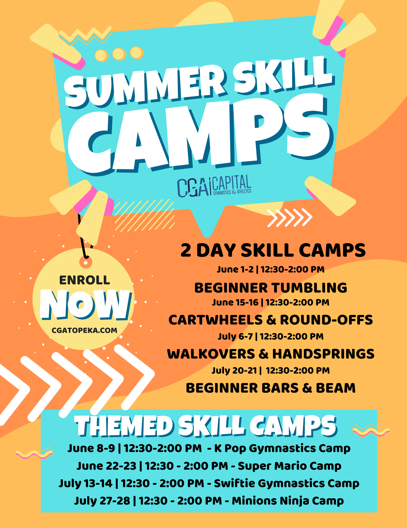 Our 2 day themed ninja and gymnastics camps will be 1.5 hours each day. Participants will get 15 minutes on each event, a craft to go with the theme, and a game or two. These camps are recommended for ages 4+. All 2 day skill camps will run on both days listed. So when you enroll you are enrolling for both days of these camps!