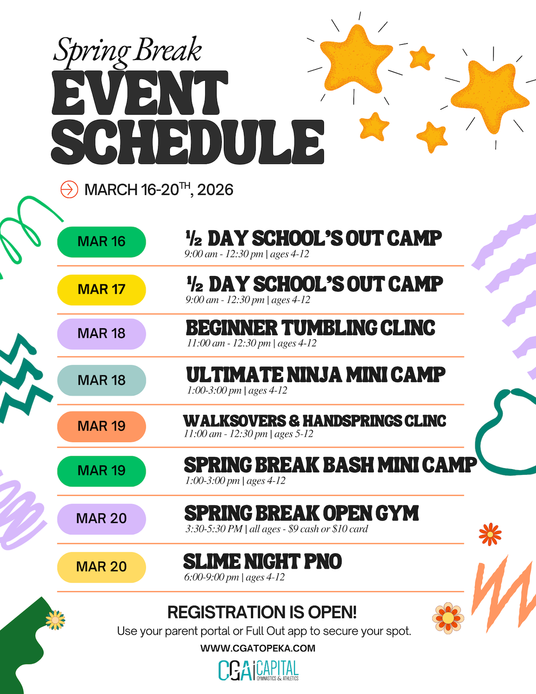 All mini camps will included 2 hours of jam packed fun with themed games, activities, crafts! Recommended for ages 4-12. Registration fees are non-refundable and non-transferable. Do not have to be currently enrolled at CGA to attend.